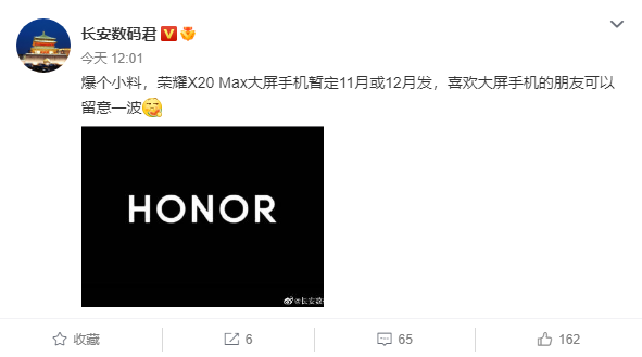 数码博主 @长安数码君 今日透露,荣耀 X20 Max 手机暂定 11 月或 12 月发布,面向大屏手机市场,值得期待。