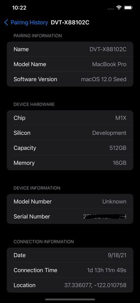 今天爆料者 @MajinBuOfficial 透露了关于苹果即将推出的 MacBook Pro 的新信息,信息显示,有人将 M1X MacBook Pro 的原型与 iPhone 配对,截图显示,苹果正在开发搭载全新 M1X 处理器、具有 512GB 存储空间和 16GB 内存的 MacBook Pro,图片并没有透露关于该设备的其它信息。截图中,DVT 指的是设计验证测试(DVT),是生产验证测试(PVT)之前的原型设计阶段。