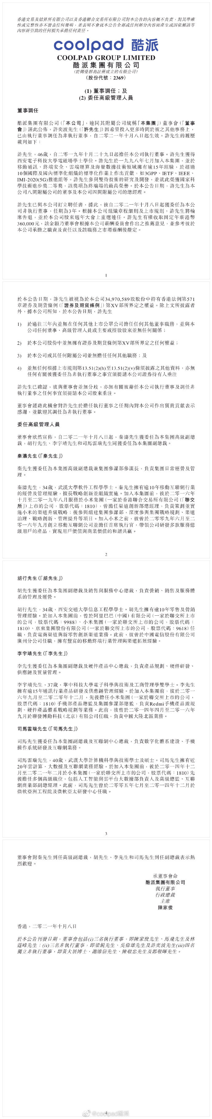 酷派集团委任秦涛等四名高管,均曾服务于小米集团