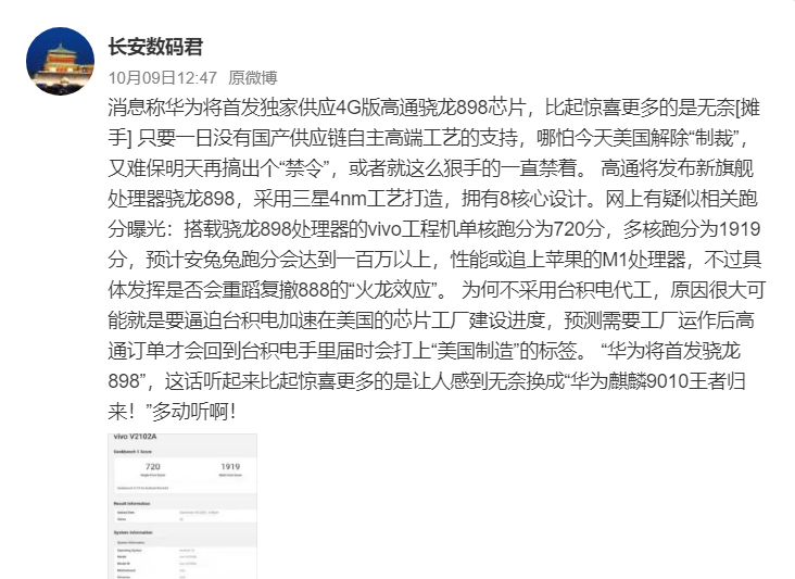 据数码博主 @长安数码君 最新发布的信息显示,全新的华为 Mate50 系列旗舰并没有取消,至于其最为致命的芯片困境,该博主也透露称,华为将首发独家供应 4G 版高通骁龙 898 芯片。而此前也有消息称,华为内部已经在测试骁龙 898 4G 芯片,预计由华为 Mate 50 系列首发,明年一季度正式亮相。