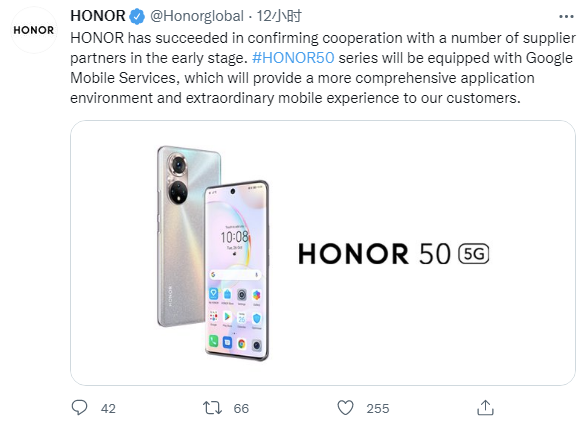 10 月 12 日消息 昨日晚间,荣耀在海外官方社交平台宣布,目前荣耀确认已恢复与谷歌的合作,而且最新的荣耀 50 系列海外机型也将预装 Google Mobile Services(GMS)。