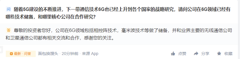 此外,该公司还表示自己在 6G 领域包括相控阵技术,毫米波等方面已有技术储备,并跟业界主要通讯公司和卫星通讯公司都有相关合作。