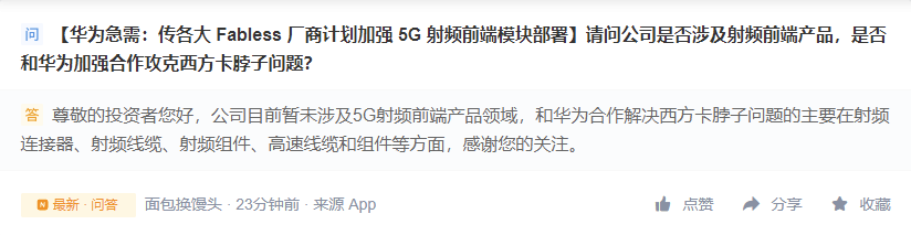 金信诺今日在互动平台向投资者回复时表示,该公司和华为合作解决西方卡脖子问题的主要在射频连接器、射频线缆、射频组件、高速线缆和组件等方面,但暂未涉及 5G 射频前端产品。