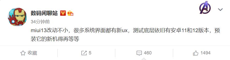 据博主 @数码闲聊站 爆料,MIUI 13 有着不小改动,很多系统界面都有新 UX,测试底层依旧有安卓 11 和 12 版本,预装它的新机得再等等。该博主还在评论区透露,MIUI 13 将于年底开放内测。