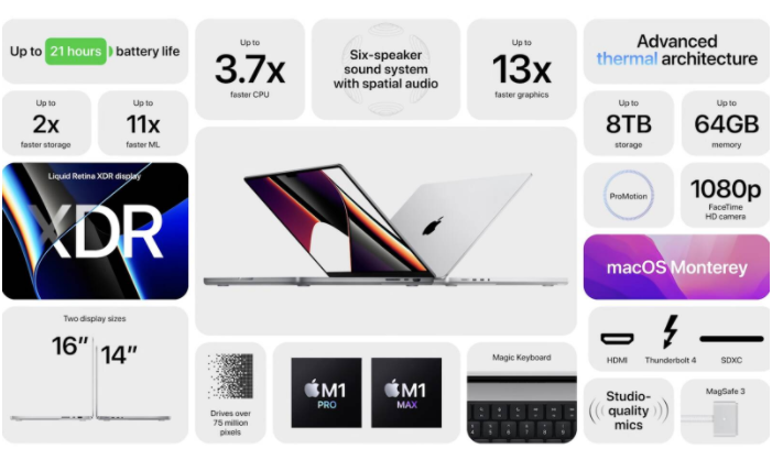 2021 款 MacBook Pro 有 14 英寸和 16 英寸两个版本,该笔记本采用全新散热设计的铝制外壳,拥有 HDMI 接口、MagSafe 充电口、SD 卡插槽、三个 Thunderbolt 4 接口。该笔记本还拥有全尺寸功能键盘。