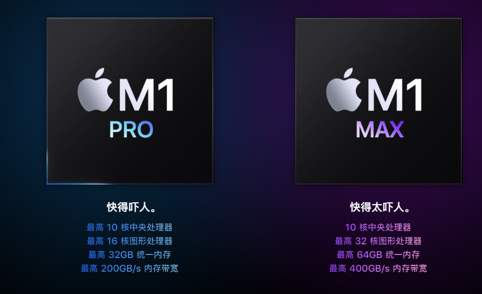 在性能方面,16 英寸和 14 英寸的 MacBook Pro 可以选配 M1 Pro 和 M1 Max 芯片,16 英寸的 MacBook Pro 搭载 M1 Pro 或 M1 Max 的性能最高可达上一代 i9 的 2 倍,M1 Pro 的图形处理速度最高可达 2.5 倍,M1 Max 的处理速度最高可达 4 倍。