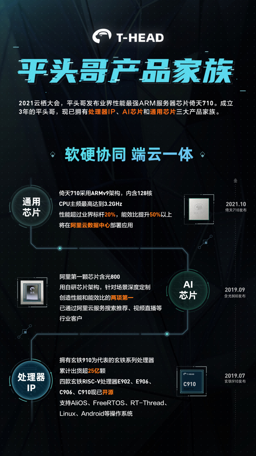 目前平头哥拥有处理器 IP、AI 芯片及通用芯片等产品家族,旗下玄铁系列处理器出货量已达 25 亿颗;两年前问世的阿里第一颗芯片含光 800 已实现规模化应用,通过阿里云服务了搜索推荐、视频直播等行业客户。