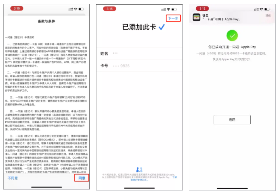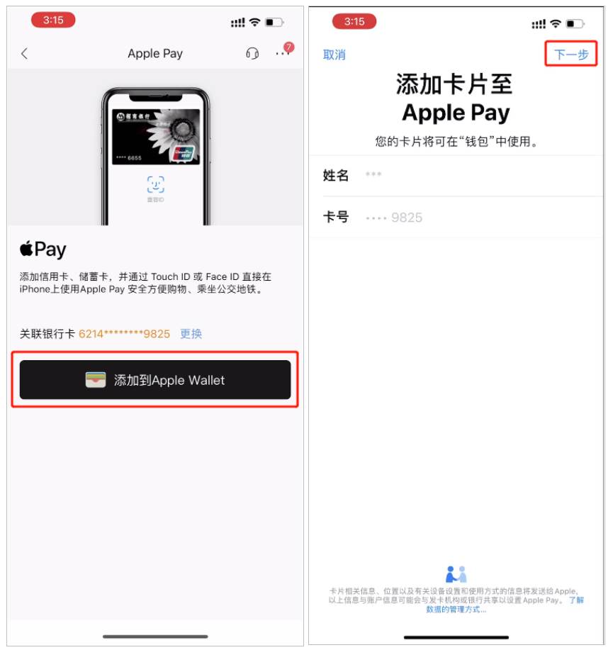 点击“打开”按钮,直接跳转至该银行 App,获取关联银行卡信息,将其“添加到 Apple Wallet”,并点击进入“下一步”,以招商银行手机银行 App 为例: