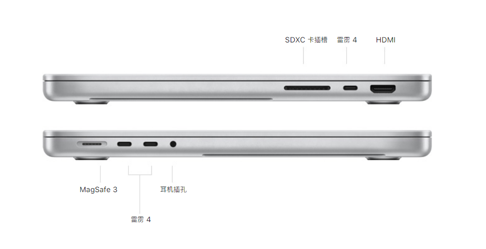 苹果官方介绍,两款机型都配备 3 个用于连接高速外接设备的雷雳 4 端口;1 个 SDXC 卡槽用于快速访问媒体内容;1 个 HDMI 端口用于便捷连接到显示器和电视;以及 1 个性能提升的耳机插孔,支持高阻抗耳机。