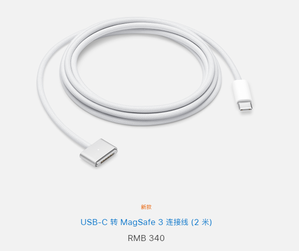 其中,140W USB-C 电源适配器的价格为 729 元,USB-C 转 MagSafe 3 连接线(2 米)的价格为 340 元。