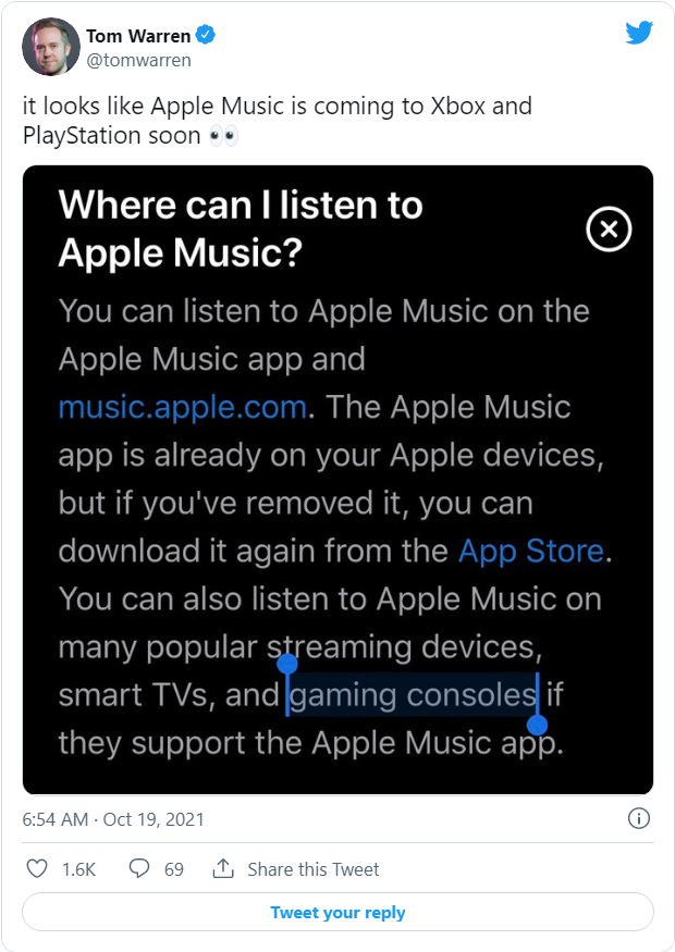 有趣的是,苹果后来再次更新了这个网页,但这次删除了关于 Apple Music 应用在游戏机上可用的说法。虽然苹果没有提到具体的设备,但 Apple Music 应用很可能会在 PlayStation 5 、Xbox Series X 等主机上发布。