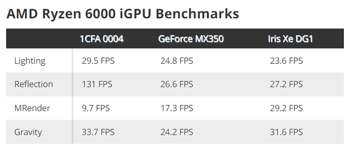 AMD 此款处理器预计将搭载 RDNA 2 架构核心显卡。跑分结果显示,核显代号“1CFA 0004”具有 512MB 共享显存,其多个项目成绩均超过了英伟达 GeForce MX350,以及英特尔锐炬 Xe DG1。如果消息属实,AMD 在这一代移动处理器终于换掉了祖传的 Vega 核显,一些轻薄本无需搭载独立显卡即可实现初级的图形性能。