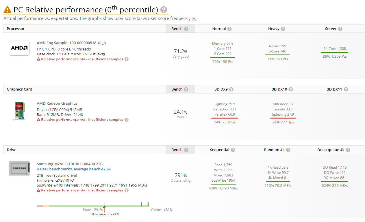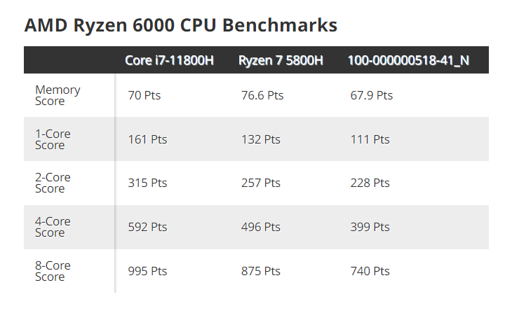 由于 AMD 这款锐龙 6000 系处理器为工程版本,因此实际跑分性能不及目前在售的 R7-5800H,也不及英特尔 i7-11800H 等处理器。外媒制作了跑分对比表格: