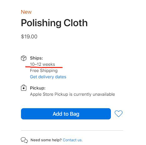 但即使是某些苹果最不复杂的产品也无法买到,包括该公司本周推出的 19 美元(中国价格 149 元)屏幕抛光布。尽管网友戏称其为“iCloth”,但依然有足够多的人购买它们,导致其变得稀缺。新订单最多要等四个月才能到货。