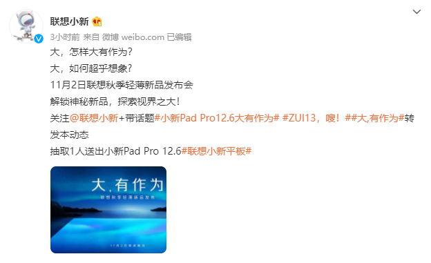 10 月 22 日消息,据联想小新官方微博,联想宣布,将在 11 月 2 日召开联想秋季轻薄新品发布会,将发布小新 Pad Pro 12.6 等新品。