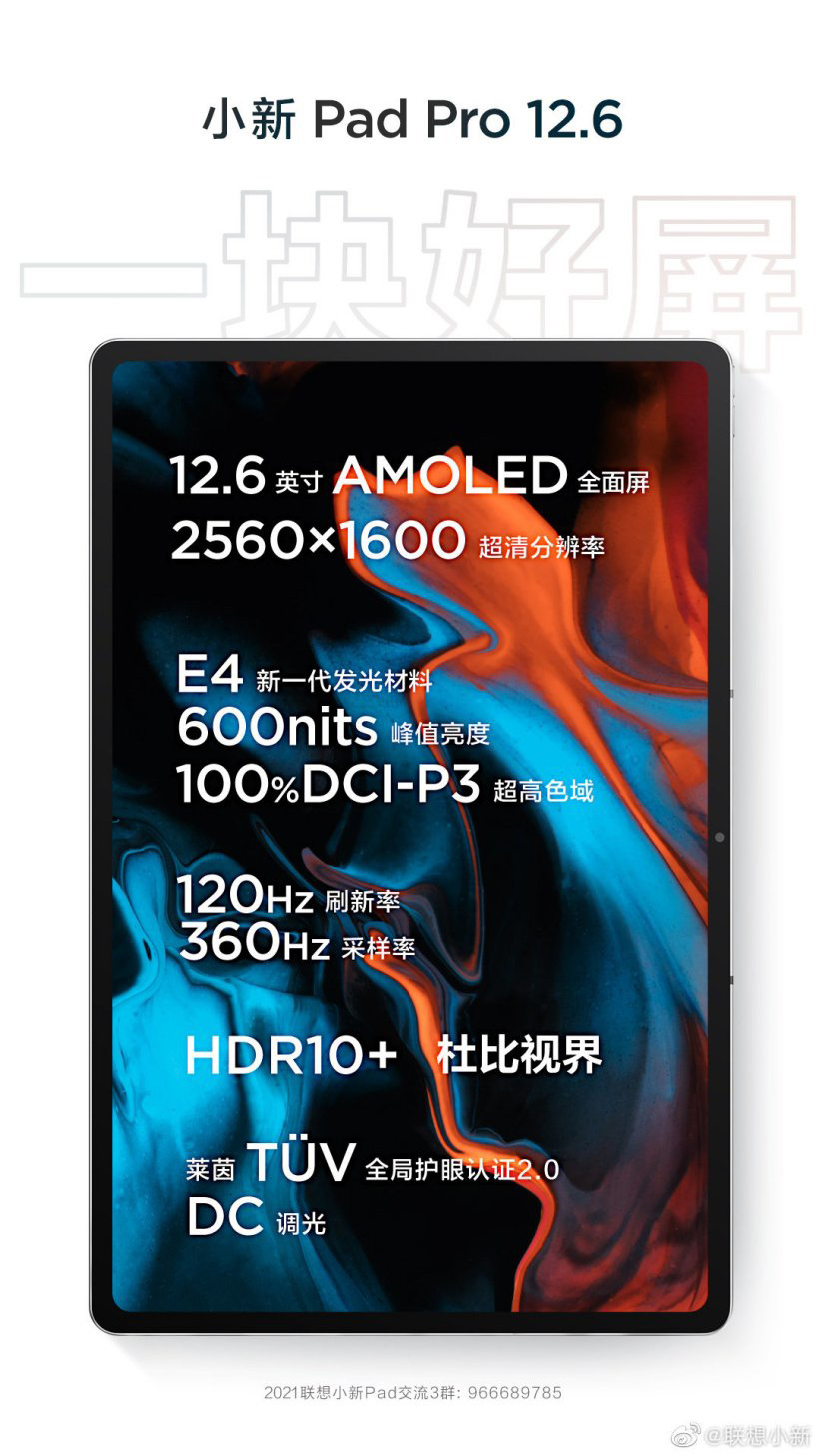 根据此前联想官方预热消息,联想小新 Pad Pro 12.6 将将采用三星 E4 发光材料 AMOLED 屏幕,拥有 2560×1600 分辨率,峰值亮度达 600nit,还支持 120Hz 刷新率。