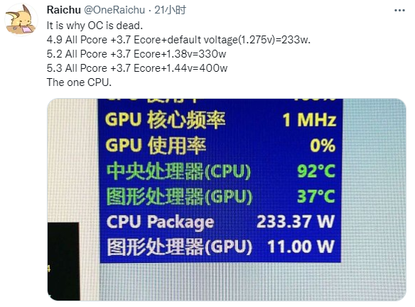 10 月 22 日消息,根据 @OneRaichu 在 Twitter 上发布的测试结果表明,即将发布的英特尔 12 代酷睿 i9-12900K 可供用户的超频空间几乎微乎其微。