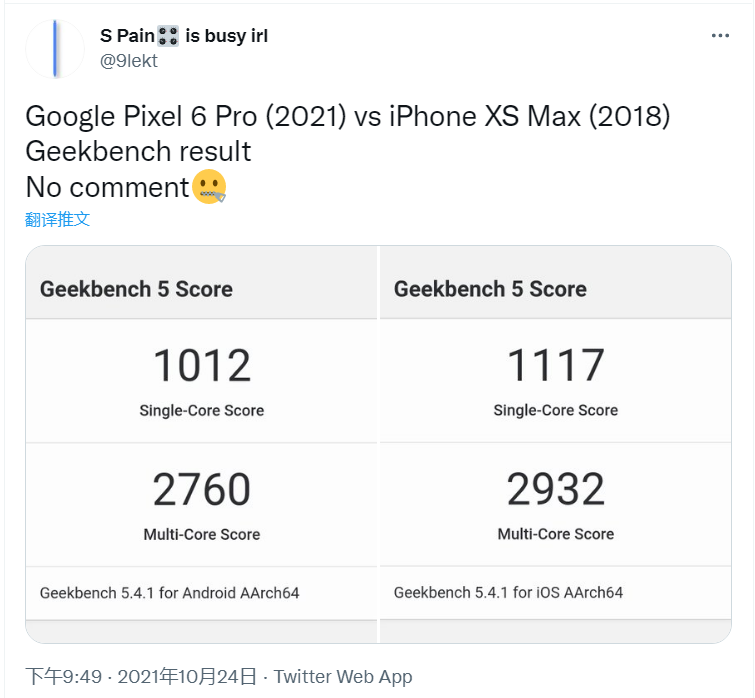 9lekt 在 Twitter 上提供的 Geekbench 5 性能跑分显示,iPhone XS Max 搭载的 A12 芯片在单核和多核测试中都击败了 Google Pixel 6 Pro 的 Tensor 芯片。