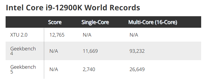 Splave 使用超频后的 i9-12900K CPU,进行了 Geekbench 4/5 跑分测试,打破了 16 核处理器的世界纪录。这款 CPU 超频后,单核成绩高达 2740 分,多核成绩 26649 分。此外,在英特尔 XTU 2.0 软件中,成绩达到了 12765 分。这名玩家表示,在进行 XTU 2.0 跑分时,处理器的大核频率必须降低至 6.7GHz,否则不稳定,无法完成测试。