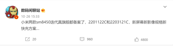知名数码博主@数码闲聊站 在近期透露:“sm8450新旗舰工程机看到了,正面还是6.7英寸左右左上角单孔曲面屏,2K+120Hz高刷屏”。结合该博主的另外一条消息:“小米两款sm8450迭代真旗舰都备案了,2201122C和2203121C,新屏幕新影像规格新快充方案……”。预计该位博主口中哦sm8450工程机应该就是小米12系列。