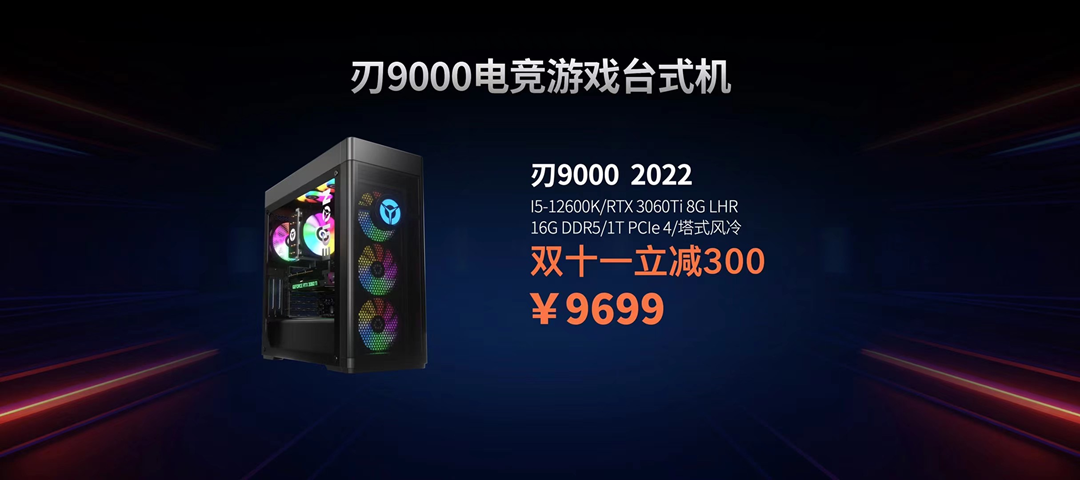 此外,联想还推出了一款拯救者刃 9000 2022 台式机,i5-12600K/RTX 3060Ti 8G LHR/16G DDR5/1T PCle 4/塔式风冷双十一到手价 9699 元。