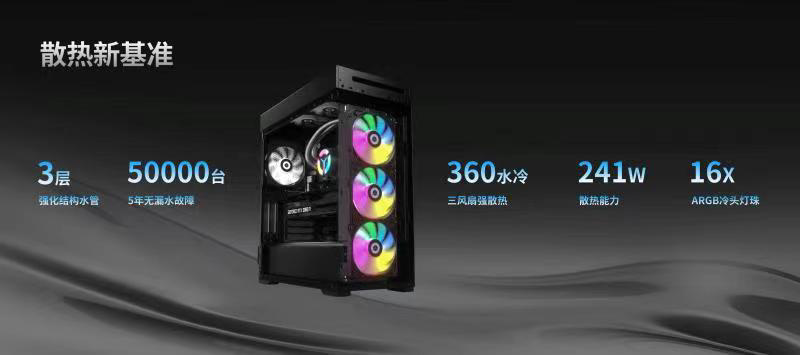 散热方面,联想拯救者刃 9000K 2022 最高可选配 360mm 水冷 ARGB 散热器,拥有 3 层强化结构水管、3x12cm 双风扇强散热,使散热能力达到 241W 水平。