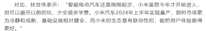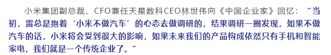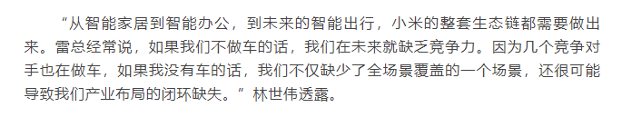 “小米不做就会被淘汰,何况我们的两家同行已经在做。智能电动汽车已经是兵家必争之地,小米不得不争。”