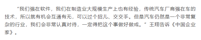 小米集团总裁王翔则表示:“小米有能力造车了,并不意味造车这个事情就变简单了,只是让我们有机会和传统最优秀的车厂掰掰手腕。”