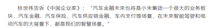 据《中国企业家》杂志,小米副总裁林世伟在接受采访时表示:雷军做调研时发现如果小米不做汽车的话将会受到很大影响;小米将布局汽车金融产业,而这未来也将是集团一个很大的业务板块,包括汽车金融、汽车保险、汽车供应链金融、车内支付等场景。