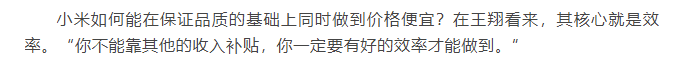 此外,王翔还讲了“雷军决定限制硬件净利率”背后的故事:虽然小米一直坚持的极致性价比,但雷军和小米其他高管们也常常苦恼于性价比会被误解为便宜。“其实性价比的核心是效率。”他解释道。