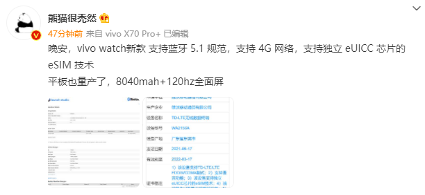 10 月 11 日,有数码博主表示 vivo 新款智能手表即将到来,除了支持上述 eSIM 功能以外还将支持 4G 网络、蓝牙 5.1 和语音输入。