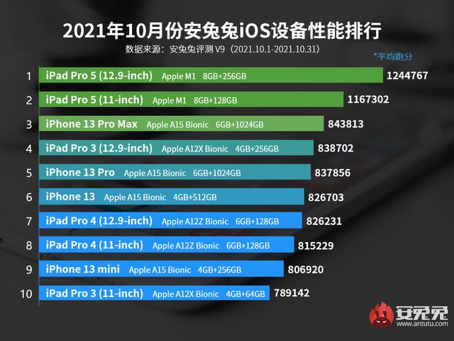 本次榜单内的后续7款产品依次为:iPad Pro 3 (12.9-inch)平均成绩838702、iPhone 13 Pro平均成绩837856分、iPhone 13平均成绩826703分、iPad Pro 4 (12.9-inch)平均成绩826231分、iPad Pro 4 (11-inch)平均成绩815229分、iPhone 13 mini平均成绩806920分、iPad Pro 3 (11-inch)平均成绩789142分。
