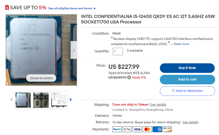 目前英特尔 i5-12400 QXDY 处理器依旧在 eBay 上销售,价格约合人民币 1455 元人民币。需要注意的是,产品购买后可能有主板不支持的风险。