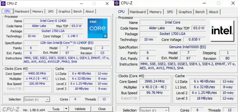 从 CPU-Z 信息可以看出,QXDY 处理器的主频最高为 4.4GHz,型号能够正常显示,而 QYHX 型号主频最高限制在 4.0GHz,对指令集的支持也有所不同。正式版酷睿 i5-12400 处理器,将会支持 AVX2、AVX512、FMA3 等指令集,TDP 65W,同时内置 UHD 770 核心显卡。