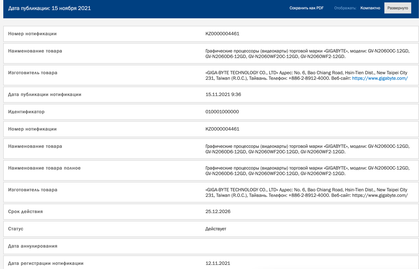 如上图所示,技嘉注册了 GV-N2060OC-12GD、GV-N2060D6-12GD、GV-N2060WF2OC-12GD 和 GV-N2060WF2-12GD 四款型号。