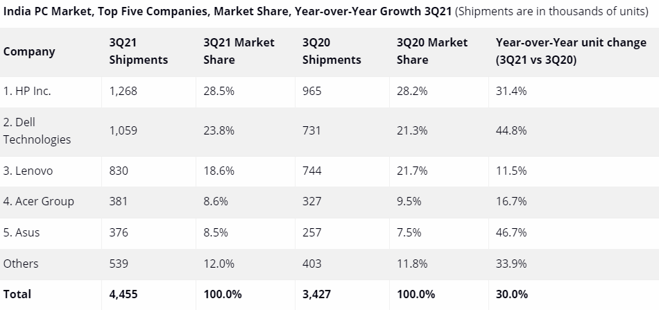 印度市场第三季度 PC 出货量:惠普、戴尔、联想前三名