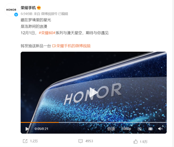 ITBEAR科技资讯11月22日消息,官方微博@荣耀手机 在今日上午官宣:“藏在梦境里的星光,是浩渺间的浪漫。12月1日,荣耀60系列与漫天星空,期待与你相遇”。这也意味着,荣耀方面有望成为12月份“大机潮”中第一个举办发布会的手机厂商。