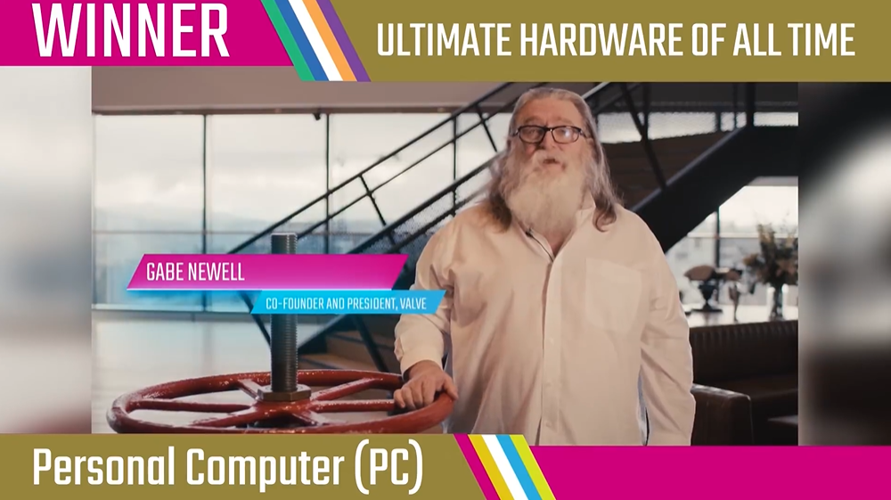 其中,PC 获得了“有史以来的终极硬件”奖,《黑暗之魂》获得了“有史以来的终极游戏”奖。Steam 之父 G 胖代表 PC 领取“有史以来的终极硬件”奖。