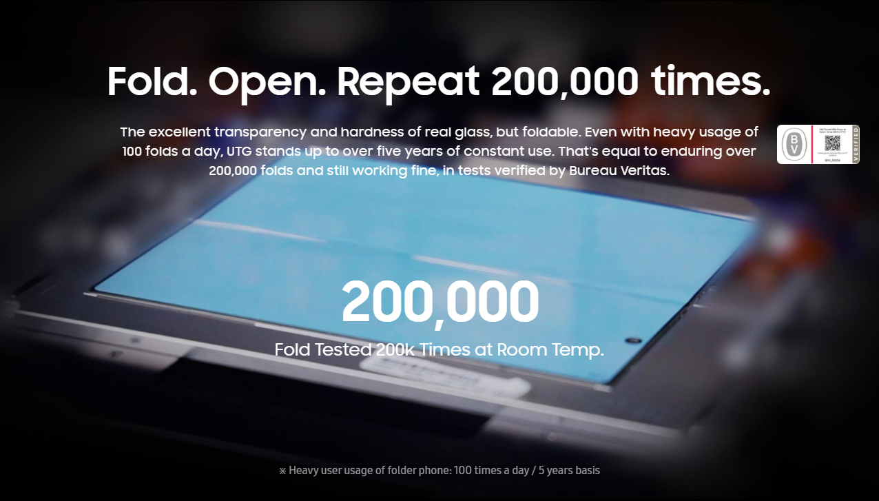 官方表示,这款屏幕表面覆盖 UTG 超薄玻璃,Bureau Veritas 对屏幕进行了折叠测试,结果表明,产品支持室温下 20 万次弯折而不损坏,这意味着每天折叠 100 次,可以连续使用 5 年。