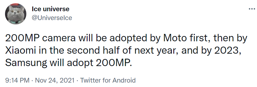 昨日晚间,数码博主 @i 冰宇宙 通过社交媒体爆料称,摩托罗拉将首发三星 2 亿像素传感器;小米将于明年下半年采用;三星则到 2023 年才会采用 200Mp 摄像头。