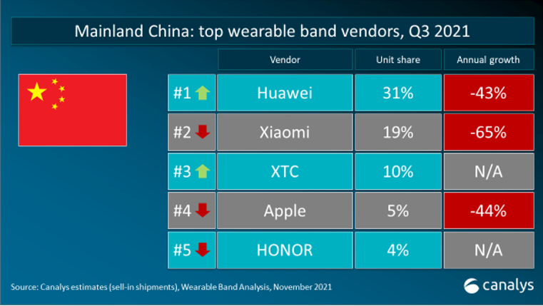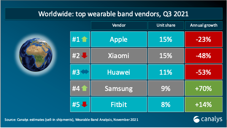 11 月 26 日消息,今日,Canalys 发布报告称,2021 年第三季度,全球可穿戴腕带设备出货量达到 4782 万台,同比下降 11 %。