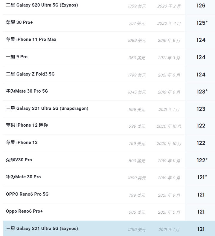 目前,三星另一款旗舰机型 Galaxy S21 Ultra 影像得分为 123/121 分(骁龙版/Exynos 版),三星 Galaxy S20 Ultra(Exynos 版) 得分则为 126 分。