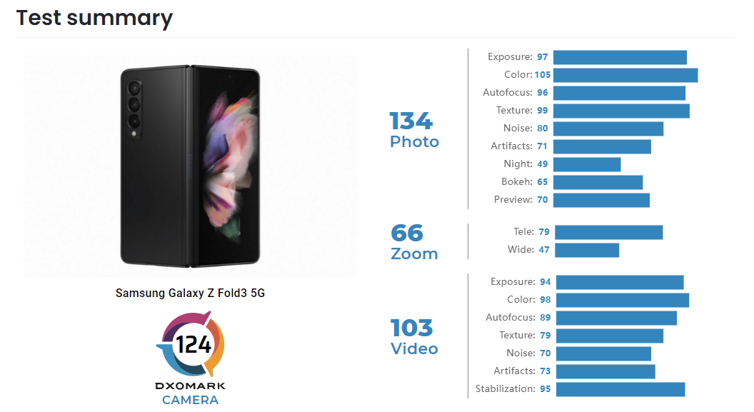 DXOMARK 对于三星 Galaxy Z Fold3 5G 的评语为“大跃进”,拍照、变焦和视频得分为 134、66、103 分。