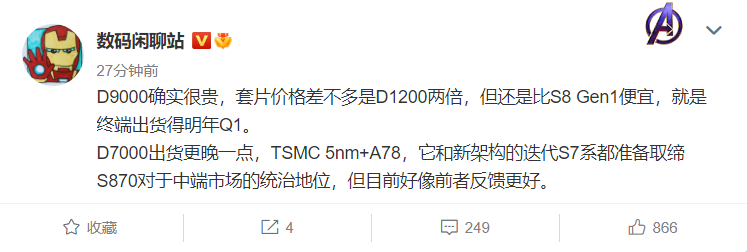 据微博博主 @数码闲聊站 称,天玑 9000 确实很贵,套片价格差不多是天玑 1200 两倍,但还是比骁龙 8 Gen1 便宜,就是终端出货得明年 Q1。