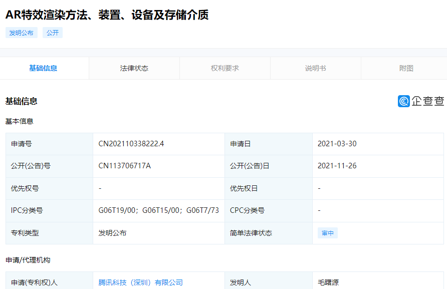 企查查专利摘要显示,本申请提供了一种 AR 特效渲染方法、装置、设备及存储介质,属于互联网和计算机领域。