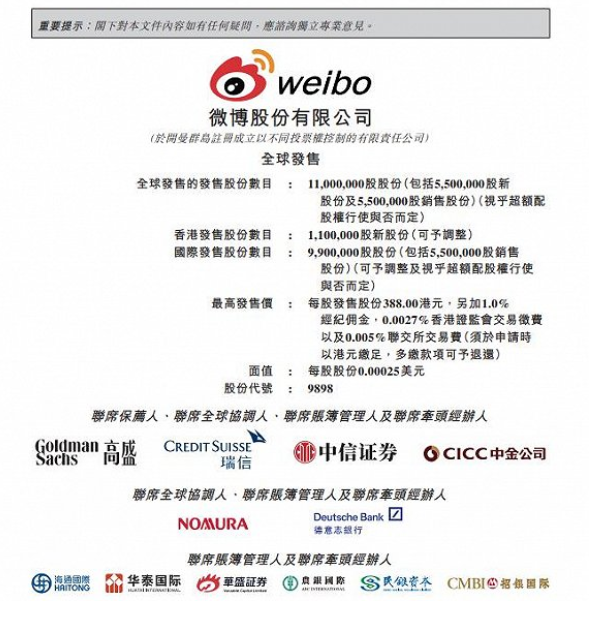 微博:拟全球发售 1100 万股,发售价将不超每股 388 港元
