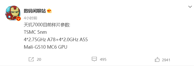 这款芯片将采用台积电 5nm 制程工艺,搭载 4×2.75GHz A78 大核,以及 4×2.0GHz A55 小核。GPU 型号为 Mali-G510 MC6。
