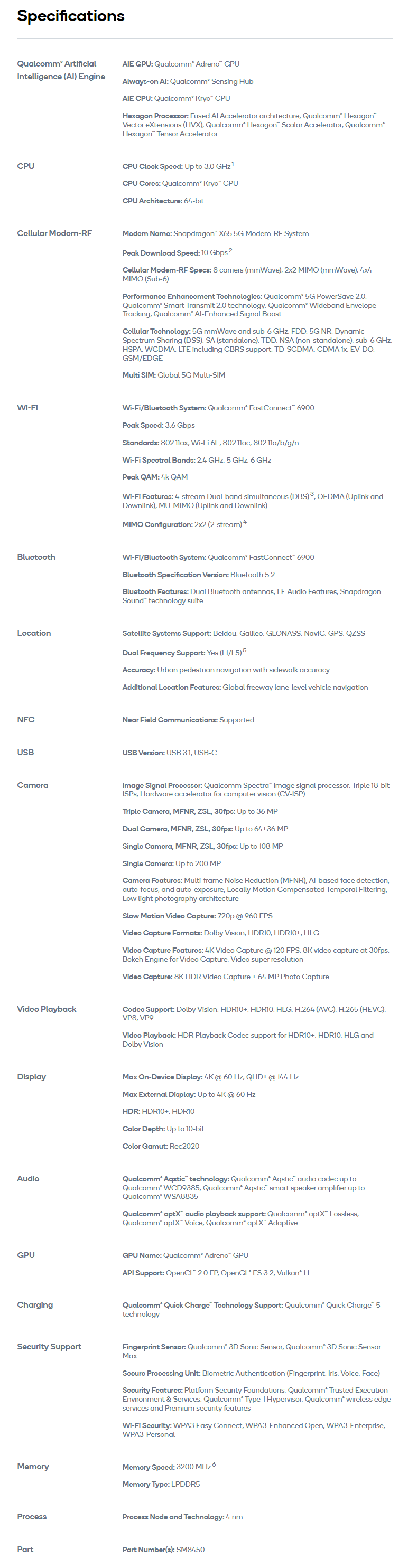 12 月 1 日消息,今早高通正式发布了骁龙 8 Gen 1 5G 移动平台(SM8450),具有骁龙 X65 调制解调器,能够实现 10Gbps 的 5G 连接速度。目前这款处理器已经正式在高通官网亮相,详细参数曝光。