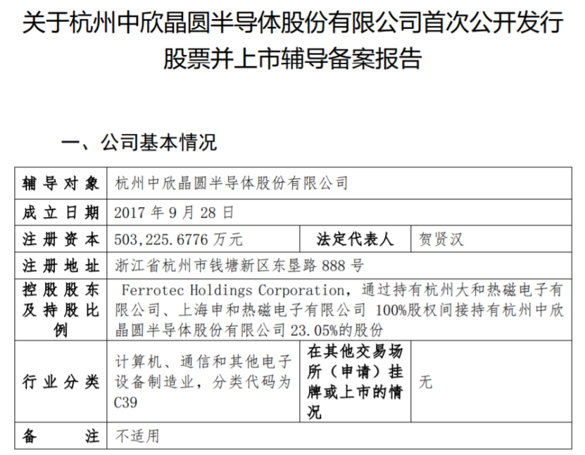 12 月 1 日,海通证券发布关于杭州中欣晶圆半导体股份有限公司首次公开发行股票并上市辅导备案报告。