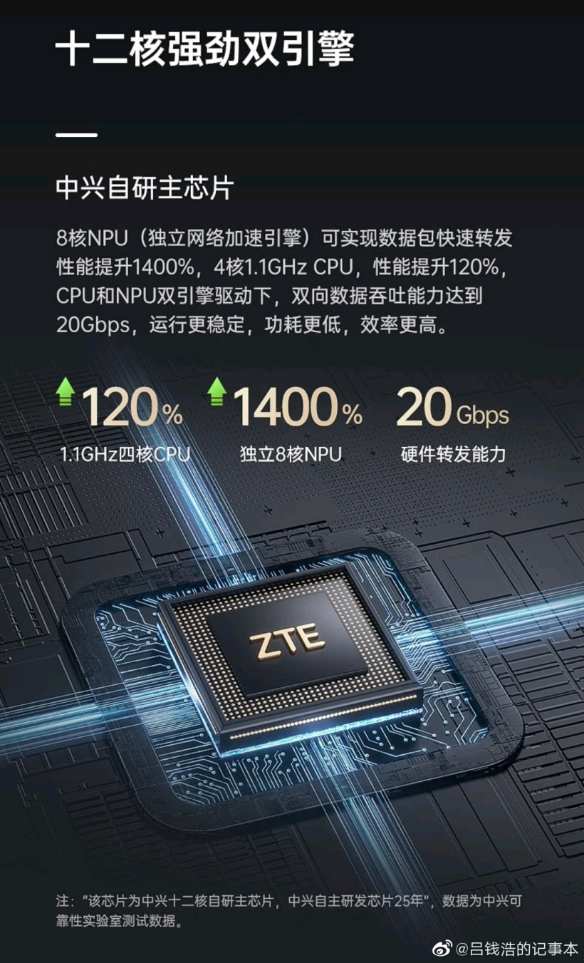 据了解,中兴 AX5400 Pro 就是搭载了这颗芯片,8 核 NPU(独立网络加速引擎)可实现数据包快速转发性能提升 1400%,4 核 1.1GHz CPU 性能提升 120%,CPU 和 NPU 双引擎驱动下,双向数据吞吐能力达到 20Gbps。